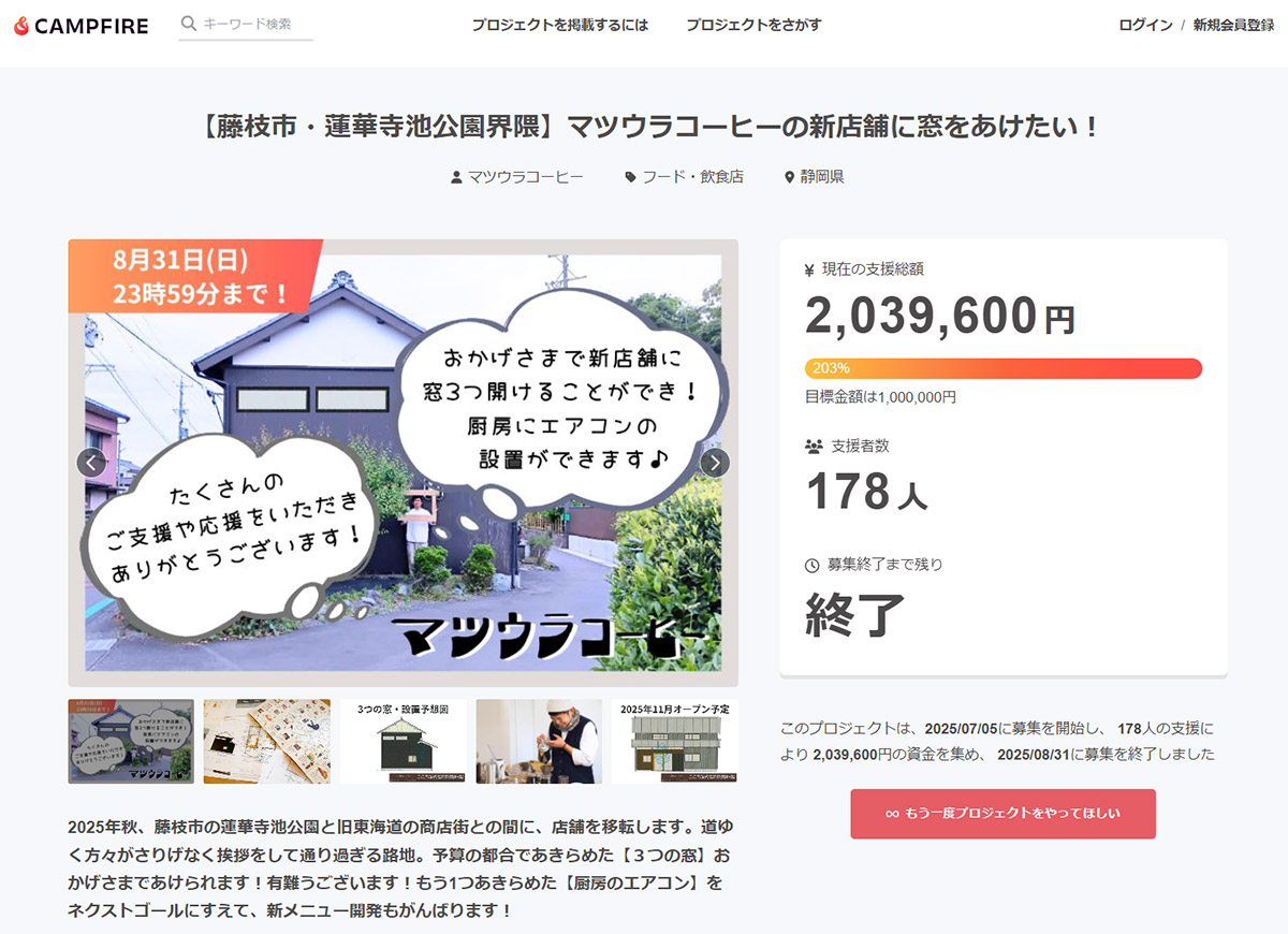 CAMPFIRE掲載プロジェクト『【藤枝市・蓮華寺池公園界隈】マツウラコーヒーの新店舗に窓をあけたい!』は、静岡県藤枝市の蓮華寺池公園のほとりにある『マツウラコーヒー』の移転にあたり、新店舗に窓及びエアコンを設置するための資金を募るプロジェクト。7月5日に募集を開始し、178人の支援により2,039,600円の資金を集め、 8月31日に募集を終了しました。
