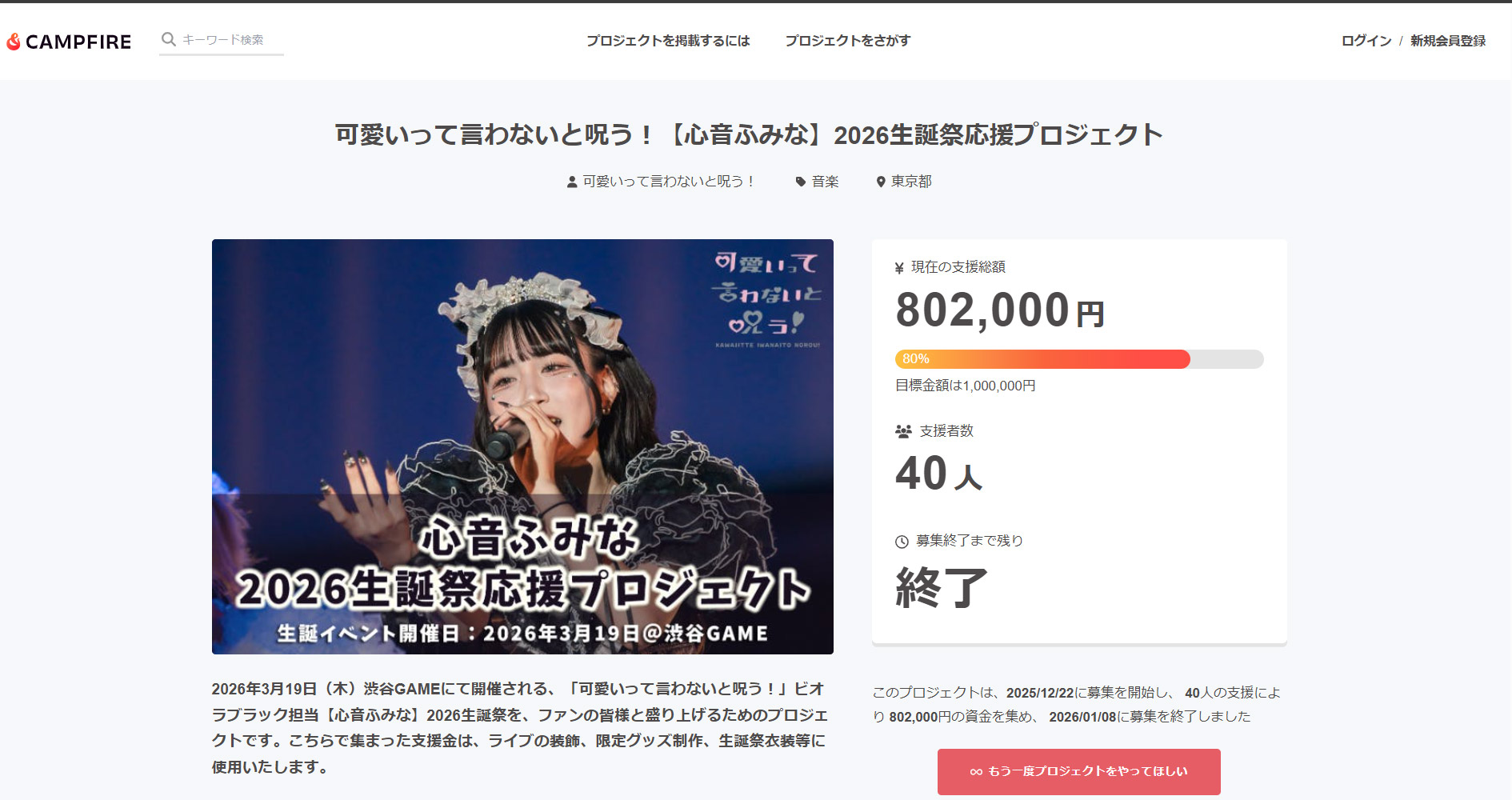 CAMPFIRE掲載プロジェクト『可愛いって言わないと呪う!【舞白ゆきだま】2026生誕祭応援プロジェクト』は、アイドルグループ「可愛いって言わないと呪う!」ビオラブラック担当【心音ふみな】さんの2026生誕祭を盛り上げるための資金を募るクラウドファンディングプロジェクトです。2025年12月22日に募集を開始し、 40人の支援により802,000円の資金を集め、 2026年1月8日に募集を終了しました。